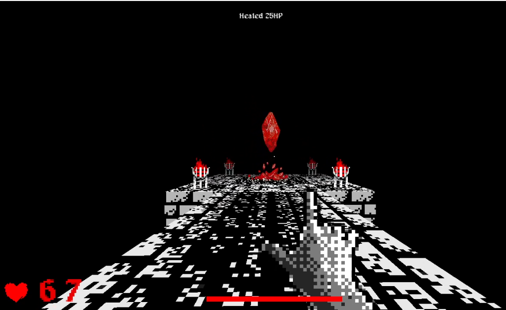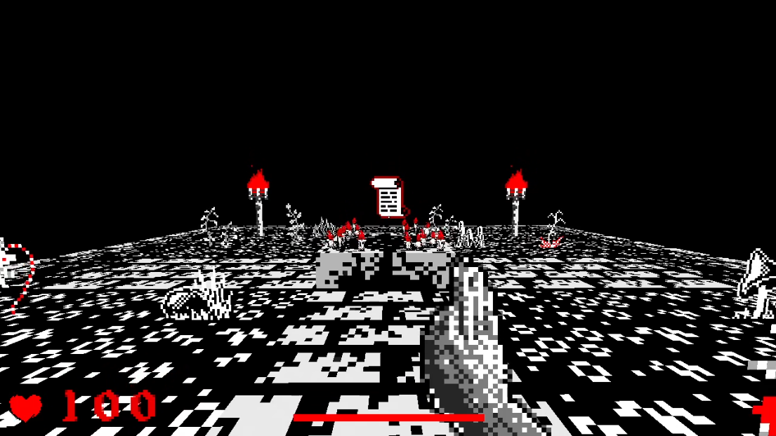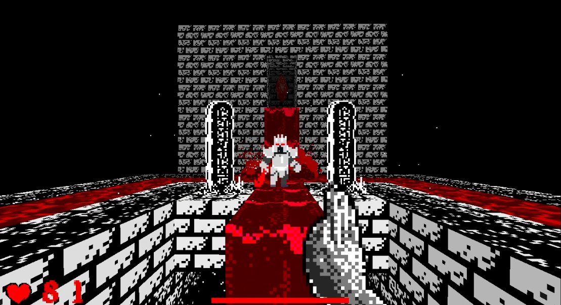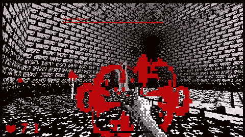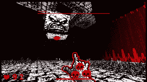 I limited myself to only 3 colours, a single map, very lo-res sprites and a limited arsenal, but still wanted to try to push some boundaries in the EFPSE engine that the game is built in, with flying enemies, boss fights, and some other neat tricks.